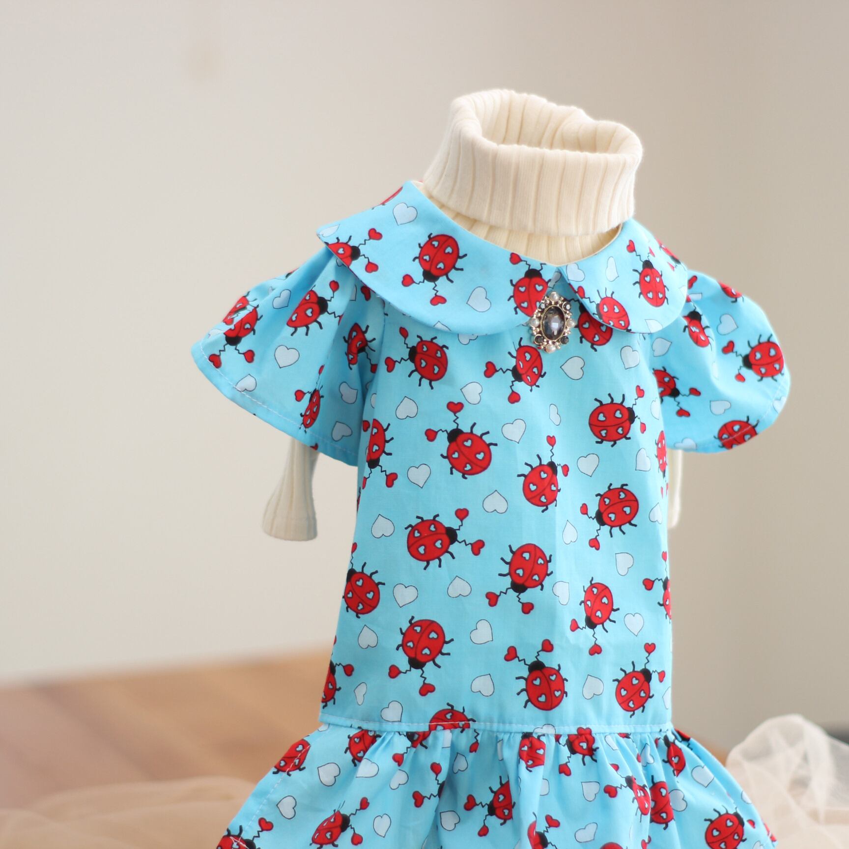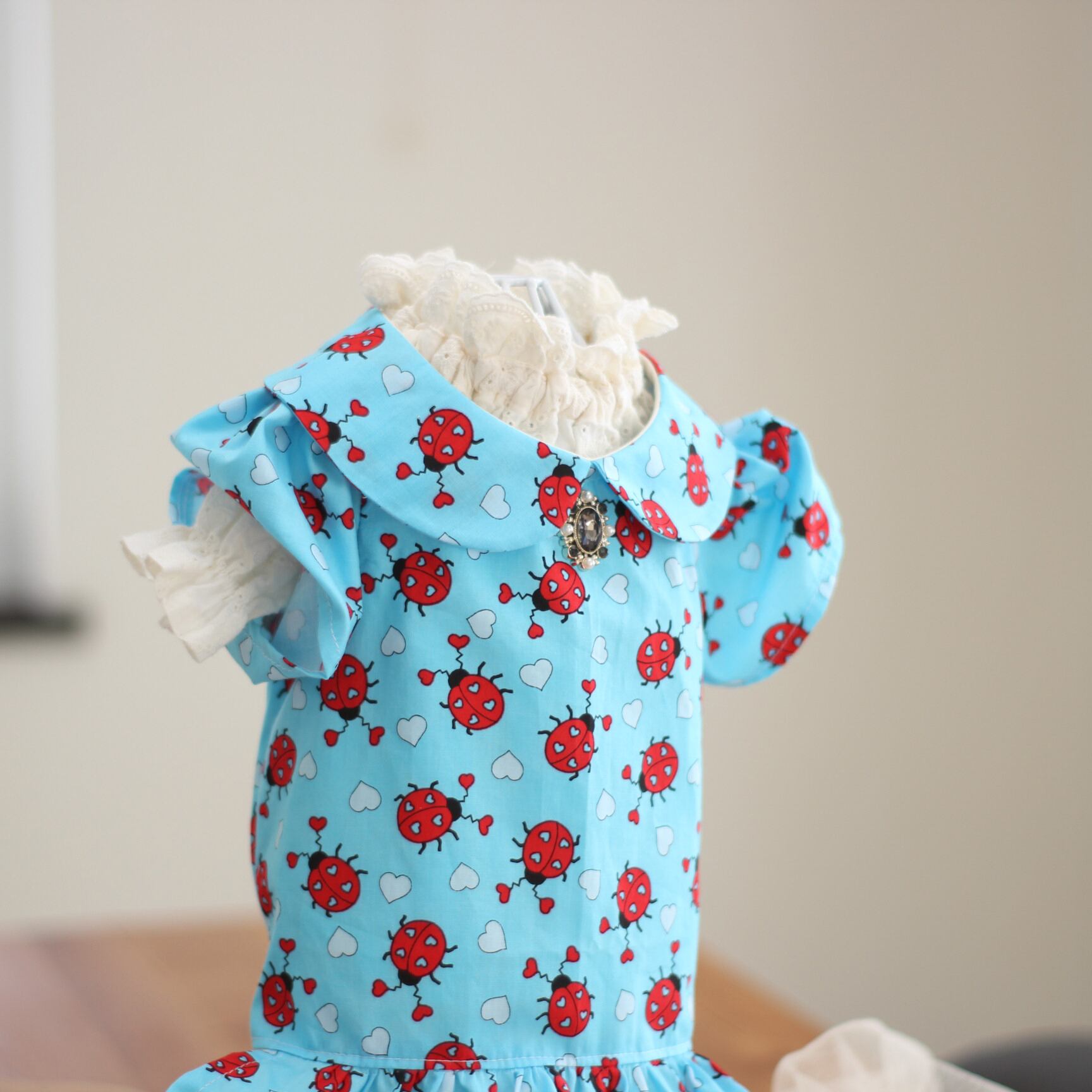 春らしいブルー地に赤いてんとう虫とハートが散りばめられた、本当に可愛いワンピース